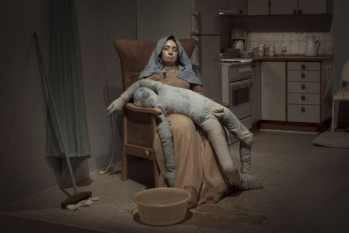 AN EXHIBITION The Sixth Sorrow – Sevenfold Pietà with Angel and Deviations stages a repetition of the Pietà motif across seven distinct tableaux of bleak domestic environments in the style of nature dioramas, museum period rooms, furniture warehouses, or outsized dollhouses. In each, viewers encounter a makeshift Pietà, though stripped of religious specificity: these are mother figures in general, holding their dead sons in abandoned rooms. The haggard corpses are rendered in a variety of materials—rough plaster, clay, sown-together towels—and at various stages of decomposition, suspending the scenes in uncertain timelines. Instead, we focus on the mothers: how long have they been sitting there? The Virgin’s garbs are far from saintly, fashioned using rubber gloves, recycled prom dresses, stained pajamas. The mothers’ faces, themselves reminiscent of death masks, all look eerily alike, but express ranging emotions—disbelief, resignation, spite. This is emphasized by harrowing songs emitting from each tableau, coos and aaahs playing on a dyssynchronous loop.The six rooms culminate in an ominous-looking tower at the end of the room, fashioned entirely in a clutter of disused textiles, duvets, and curtains. A number of female characters schlepping gargantuan bags on their backs are seen approaching the tower entrance, perhaps to finally dispose of their oversized goods. Inside the tower, viewers are confronted with interior walls doused in black tar. The smell of tar engulfs the viewer, its glistening blackness producing a sense of near total, infinite darkness. In the middle stands a makeshift concrete well, its water equally black. A final figure appears in the work: the titular angel, who hovers slightly above a pile of sandals in what appears to be a tiled backroom. Its head faces the ground with resignation; it is unclear if it is ascending or descending. We hear the angel joining the women’s lament; in fact, it seems to sing the loudest. Jeppe Ugelvig Tickets: On site (Adults: DKK 60,- Children u. 18: Free) Dates & Times: Place: Horsens Kunstmuseum, Carolinelundsvej 2, 8700 Horsens, Denmark Concept: Signa Köstler Exhibition Design: Signa Köstler, Arthur Köstler, Lorenz Vetter Audio Concept and Technical Design: Arthur Köstler Artistic Collaboration: Tristan Kold Construction: Lorenz Vetter, Asbjørn Thernøe, Arthur Köstler, Signa Köstler Assisted by: Emilie Hartmann Kuang, Lisa Beck, Ebbe Sørensen, Dorthe Elkjær Composition: Elias Gottstein Sound Design: Christian Bo Johansen Singers: Birthe Jacobsen, Dorthe Danscher, Gitte Sorgenfrei, Inger Due, Jette Irene Kjær, Karin Rabjerg Vestergaard, Line Langvad Johansen, Pernille Krarup Photography: Erich Goldmann Special Thanks: Danscher Koret Supported by: |